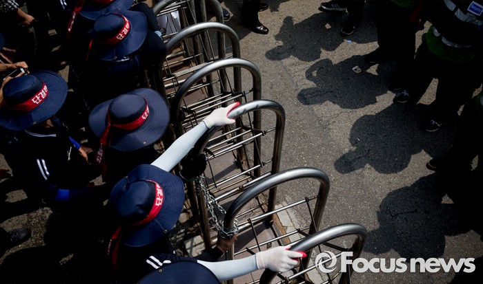 (아산=포커스뉴스) 1일 오후 충남 아산 탕정면 갑을오토텍에서 노조원들과 사측 경비 용역들이 대치하고 있다.