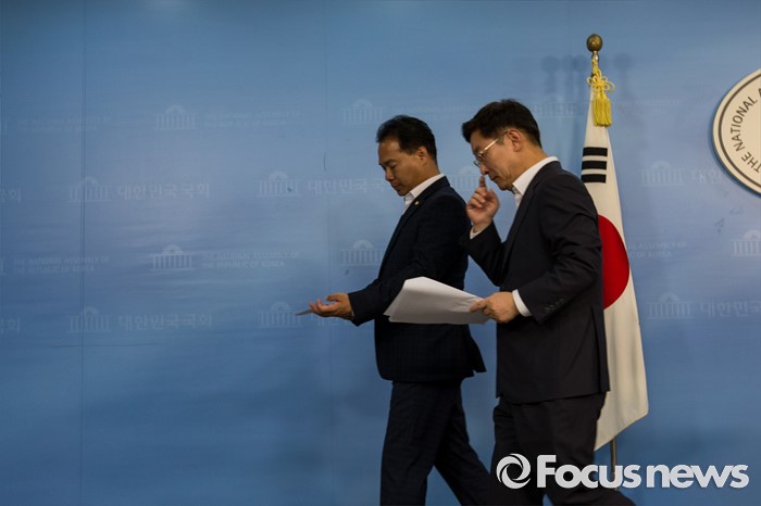 (서울=포커스뉴스) 박범계(오른쪽) 더불어민주당 의원과 이용주 국민의당 의원이 2일 오후 서울 여의도 국회에서 고위공직자 비리수사처 관련 경과 및 향후 일정에 대해 발표를 마친 뒤 브리핑실을 나서고 있다.
