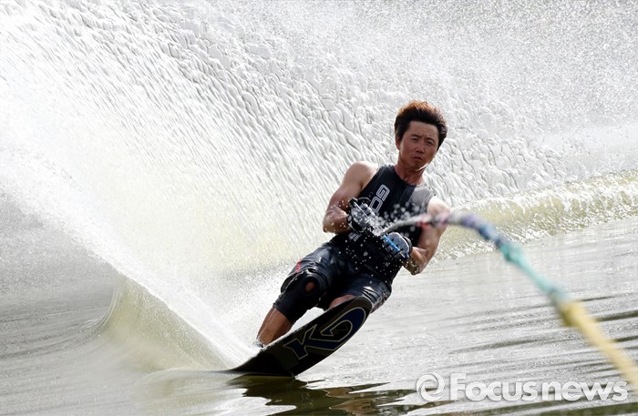(공주=포커스뉴스) 3일 오후 충남 공주시 금강변에서 수상스포츠전문가들이 스상스키를 타며 물살을 가르고 있다.