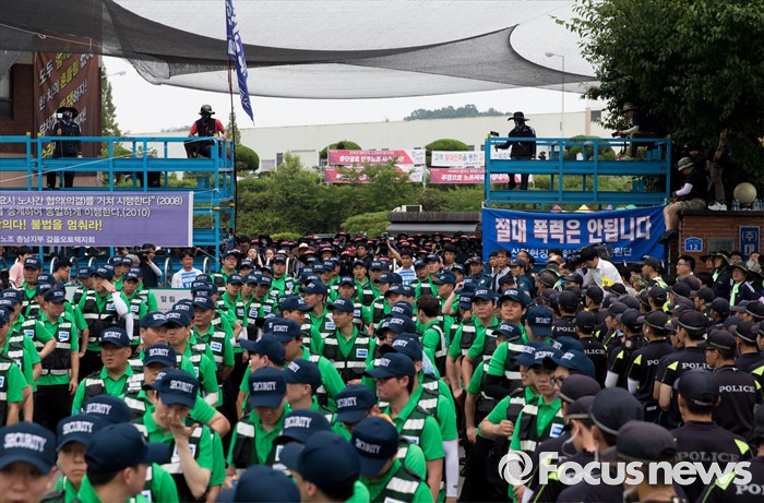 (아산=포커스뉴스) 1일 오후 충남 아산 탕정면 갑을오토텍에서 노조원들과 사측 경비 용역들이 대치하고 있다.