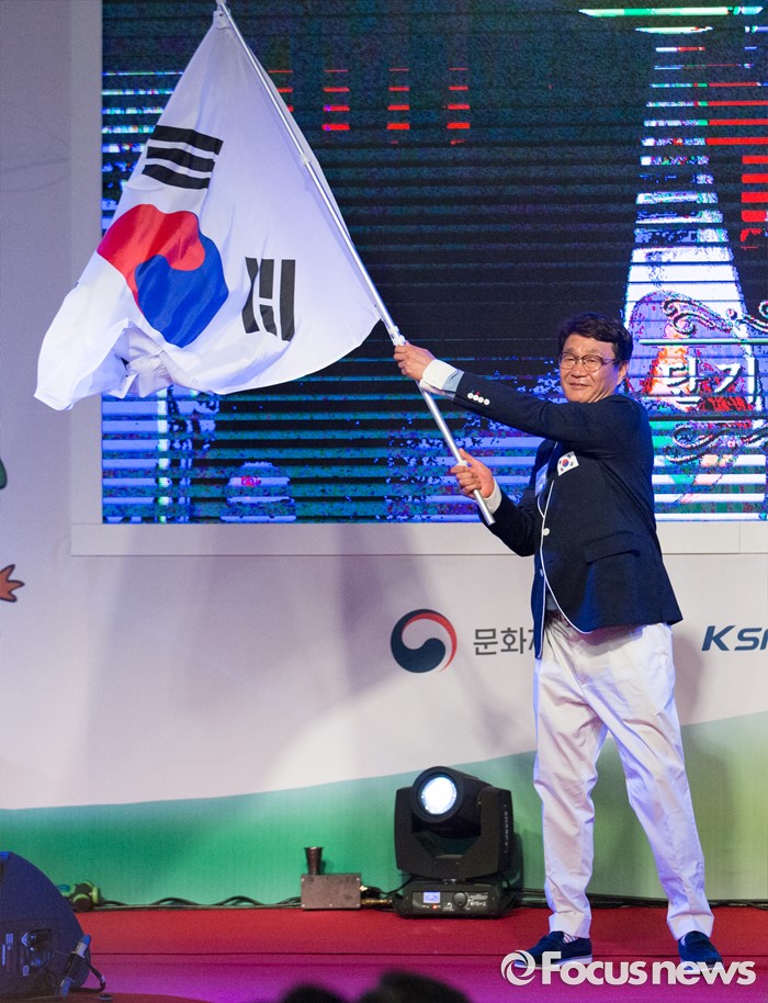 (서울=포커스뉴스) 2일 오후 서울 송파구 올림픽파크텔에서 열린 2016 리우 패럴림픽 대한민국 선수단 결단식에 참석한 정재준 선수단장이 김성일 대한장애인체육회 회장에게 전달받은 태극기를 흔들고 있다.