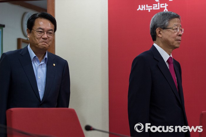 (서울=포커스뉴스) 김희옥(오른쪽) 새누리당 혁신비상대책위원장과 정진석 원내대표가 1일 오전 서울 여의도 새누리당사에서 열린 혁신비상대책위원회의에 참석하기 위해 회의실로 들어서고 있다.