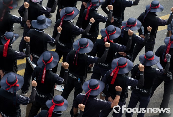 (아산=포커스뉴스) 1일 오후 충남 아산 탕정면 갑을오토텍에서 노조원들과 사측 경비 용역들이 대치하고 있다.