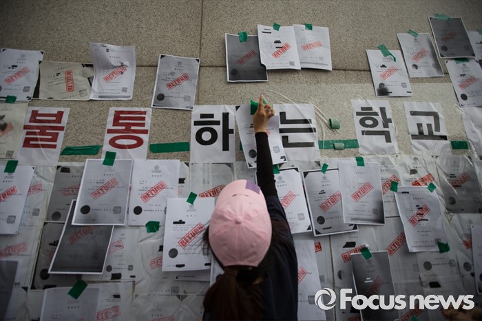 (서울=포커스뉴스) 이화여대 미래라이프 대학 설립 문제로 학교와 학생들이 갈등을 빚고 있는 2일 오후, 서울 서대문구 이화여대에서 미래라이프 대학 설립에 반대하는 이화여대 졸업생들이졸업장 반납 퍼포먼스를 하고 있다.