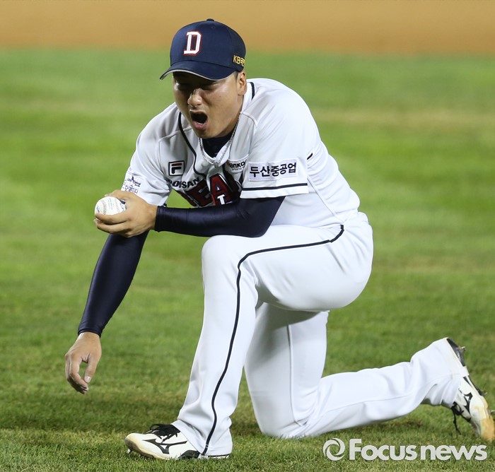 | △ 고통스러워하는 두산 투수 정재훈 |