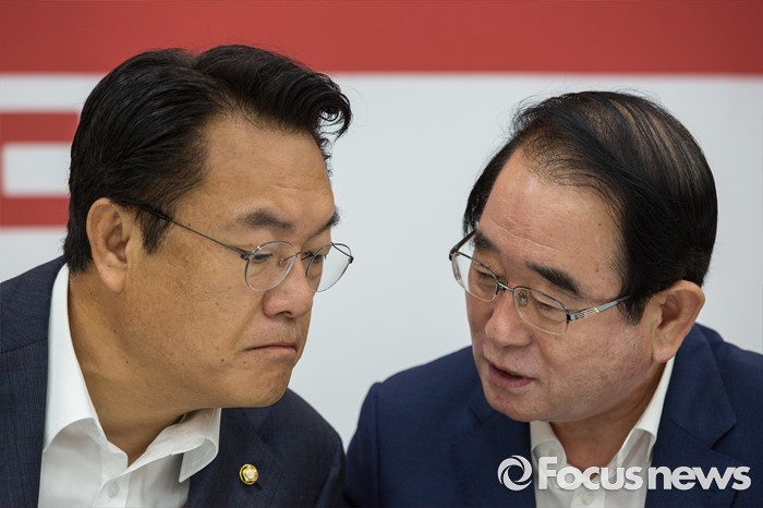| △ 의견 나누는 정진석 원내대표-박명재 사무총장 |