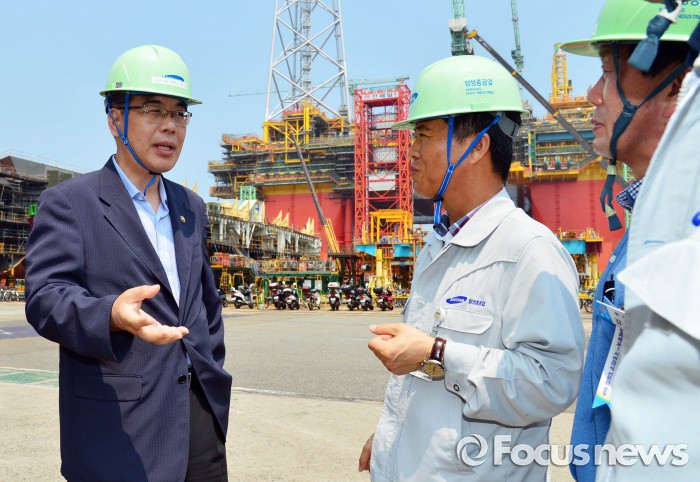 (거제=포커스뉴스) 송언석 기획재정부 2차관이 1일 경남 거제시 소재 삼성중공업 조선소를 방문해 사업장 시찰을 하고 있다. <사진제공=기획재정부>