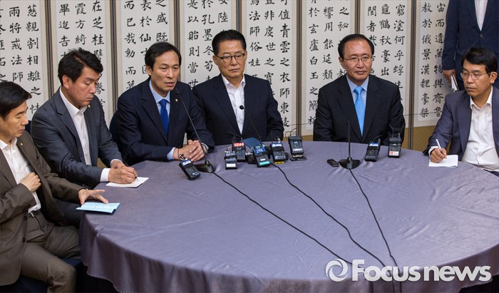 (서울=포커스뉴스) 우상호(왼쪽 세 번째) 더불어민주당 원내대표가 3일 오전 서울 여의도 국회에서 열린 원내대표 회동에 참석해 모두발언 하고 있다.