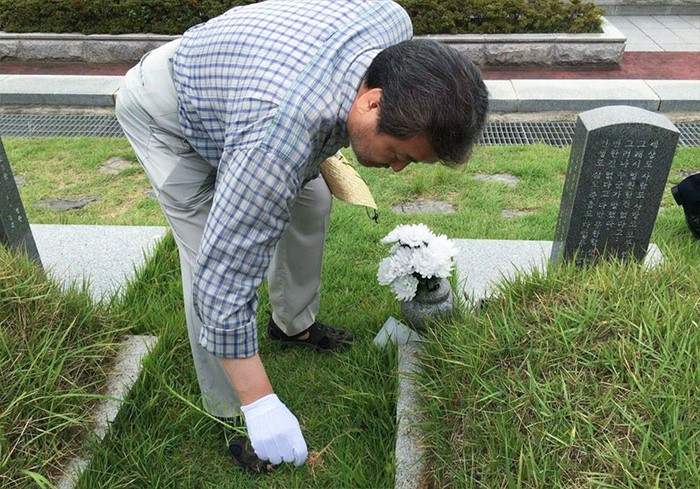 (서울=포커스뉴스) 전국 민생투어 중인 김무성 새누리당 전 대표가 3일 오전 광주 국립5·18민주묘지를 방문해 참배한 뒤 열사 묘역의 잡초를 제거하고 있다. <사진제공=김무성 전 대표 페이스북>