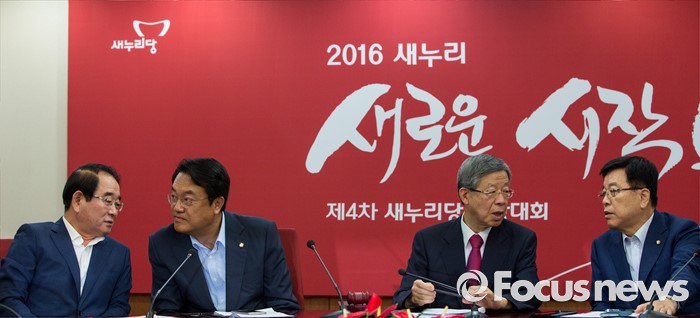 (서울=포커스뉴스) 새누리당 지도부가 1일 오전 서울 여의도 새누리당사에서 열린 혁신비상대책위원회의에 참석해 대화 하고 있다. 왼쪽부터 박명재 사무총장, 정진석 원내대표, 김희옥 혁신비상대책위원장, 김광림 정책위의장.