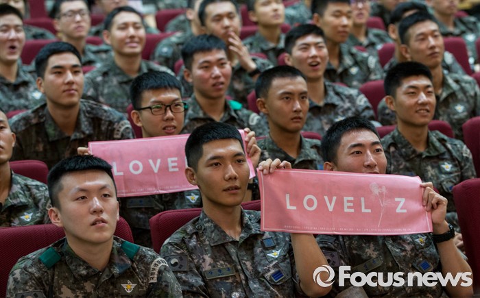 (서울=포커스뉴스) 2일 오전 서울 용산구 국방부에서 열린 '군인 금연 홍보 엔젤스 위촉식'에 참석한 군장병들이 그룹 러블리즈를 응원하는 손펼침막을 들고 있다.