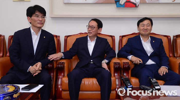(서울=포커스뉴스) 1일 서울 여의도 국회에서 여야3당 원내수석부대표가 8월 임시국회 세월호 특별법 연장과 추경 등 현안 관련 공조 협의를 위한 회동에서 대화를 나누고 있다. 왼쪽부터 더불어민주당 박완주, 새누리당 김도읍, 국민의당 김관영.