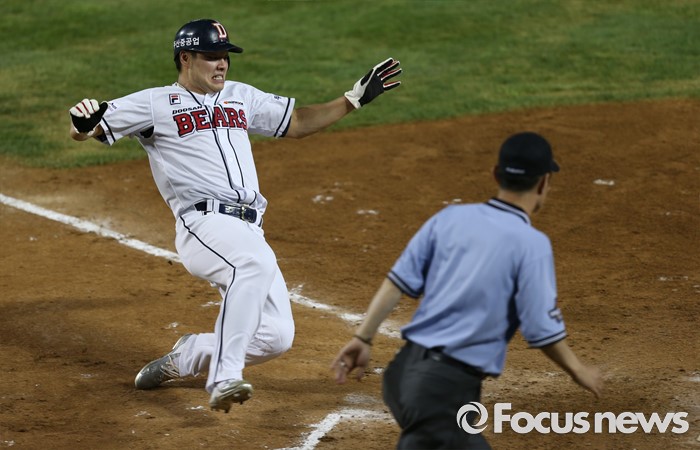 (서울=포커스뉴스) 2일 오후 서울 잠실구장에서 열린 2016 프로야구 LG-두산 경기 4회말 에반스의 안타에 1루주자 민병헌이 홈인하고 있다.