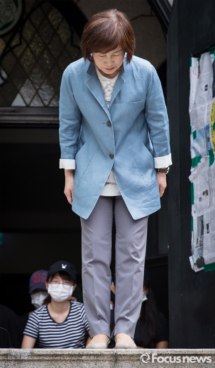 (서울=포커스뉴스) 최경희 이화여자대학교 총장이 3일 오후 서울 서대문구 이화여대 본관에서 평생교육 단과대학인 '미래라이프대학' 설립 중단 발표를 마친 뒤, 사과 인사를 하고 있다.