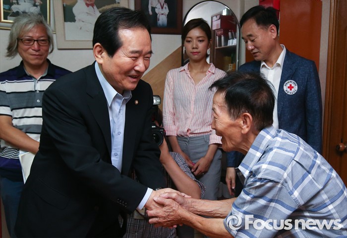 (서울=포커스뉴스) 정세균 국회의장이 2일 오전 서울 종로구 창신동에 거주하고 있는 고령 이산가족 김문각 할아버지(84세, 평안남도 양덕군 청계리) 가정을 방문해 김 할아버지와 인사하고 있다.