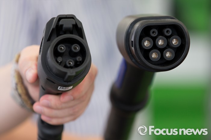 (서울=포커스뉴스) 2일 오후 서울 마포구 상암월드컵경기장에서 열린 개방형 전기차 충전소 1호 착공식에서 급속충전기와 플러그인 코드가 전시돼 있다.
