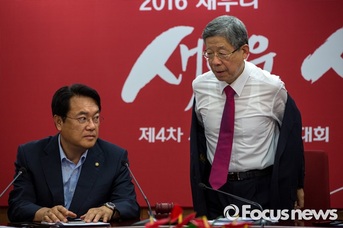 (서울=포커스뉴스) 김희옥(오른쪽) 새누리당 혁신비상대책위원장이 1일 오전 서울 여의도 새누리당사에서 열린 혁신비상대책위원회의에 참석해 공개회의를 마친 양복 상의를 벗고 있다.