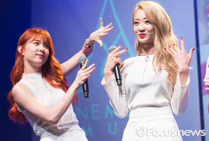 (서울=포커스뉴스) 4일 오전 서울 도봉구 플랫폼창동61에서 열린 걸그룹 나인뮤지스A의 싱글앨범 'MUSES DIARY' 발표 쇼케이스에 참석한 멤버 혜미(왼쪽)가 경리를 소개하고 있다.