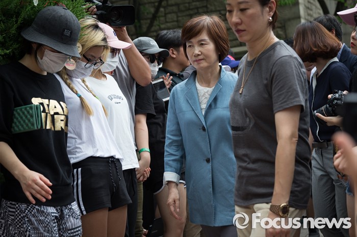 (서울=포커스뉴스) 최경희(오른쪽 세번째) 이화여자대학교 총장이 3일 오후 서울 서대문구 이화여대에서 평생교육 단과대학인 '미래라이프대학' 설립 중단 발표를 하기 위해 학생들이 점거 중인 본관 농성장으로 향하고 있다.