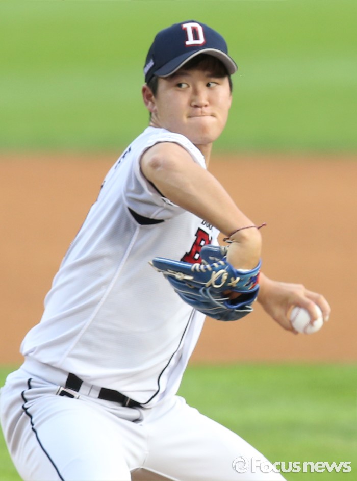 (서울=포커스뉴스) 3일 서울 잠실구장에서 열린 2016 프로야구 LG-두산 경기에서 1회초 두산 선발투수 진야곱이 투구하고 있다.