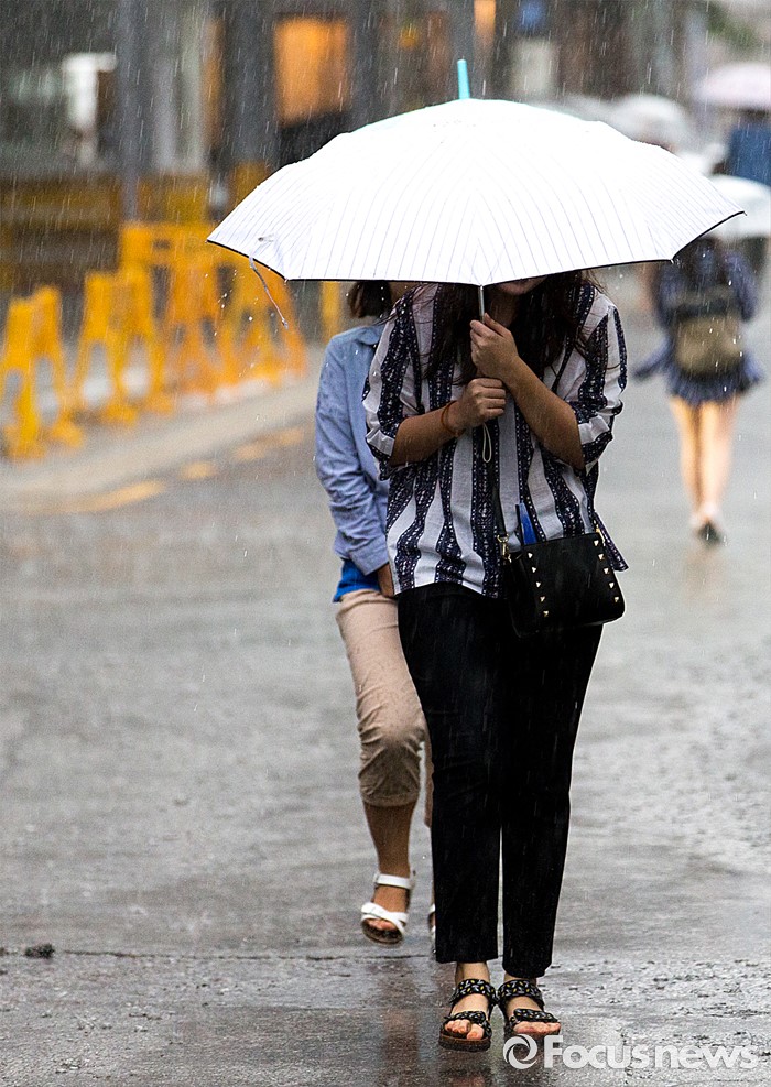 (서울=포커스뉴스) 천둥, 번개를 동반한 강한 비가 내린 2일 오후 서울 서초구 교대역 주변에서 시민들이 비를 피해 발걸음을 재촉하고 있다.