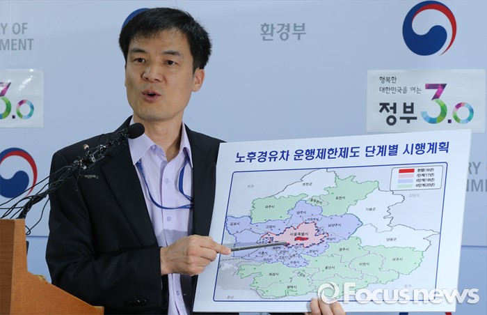 (세종=포커스뉴스) 홍동곤 환경부 교통환경과장이 2일 오전 세종시 정부세종청사 환경부 기자실에서 수도권 서울시, 경기도, 인천시는 수도권 대기관리권역에 등록한 노후경유차에서 발생하는 미세먼지를 줄이기 위해 노후경유차 운행제한제도를 시행하기로 의견을 모으로 4일 합의한다고 밝히고 있다.