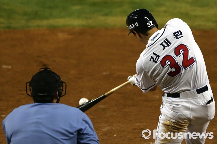 (서울=포커스뉴스) 2일 오후 서울 잠실구장에서 열린 2016 프로야구 LG-두산 경기 8회말 무사 상황, 김재환이 우익수 앞 1루타를 치고 있다.