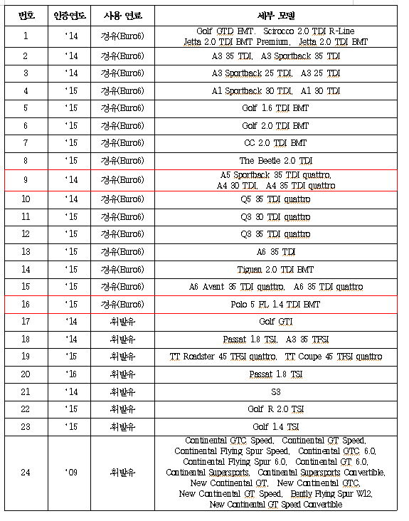 이번에 인증이 취소된 차량은 지난 2009년부터 올해 7월25일까지 판매된 차량이다. 이 중에서 골프 GTD BMT 등 27개 차종(66개 모델)은 최근까지 판매되고 있었으며, A6 3.0 TDI 콰트로 등 나머지 5개 차종(14개 모델)은 판매가 중단된 차종이다.