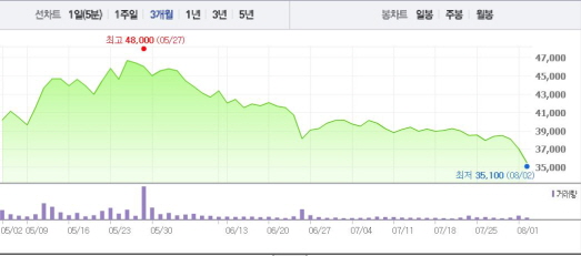 이날 장 중 초반 주가는 3만5100원을 기록, 52주최저가(3만6450원)을 경신했다.