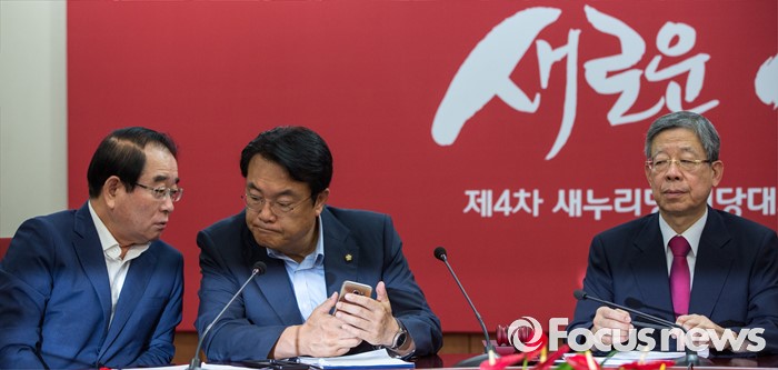 (서울=포커스뉴스) 정진석(가운데) 새누리당 원내대표와 박명재(왼쪽) 사무총장이 1일 오전 서울 여의도 새누리당사에서 열린 혁신비상대책위원회의에 참석해 대화 하고 있다.