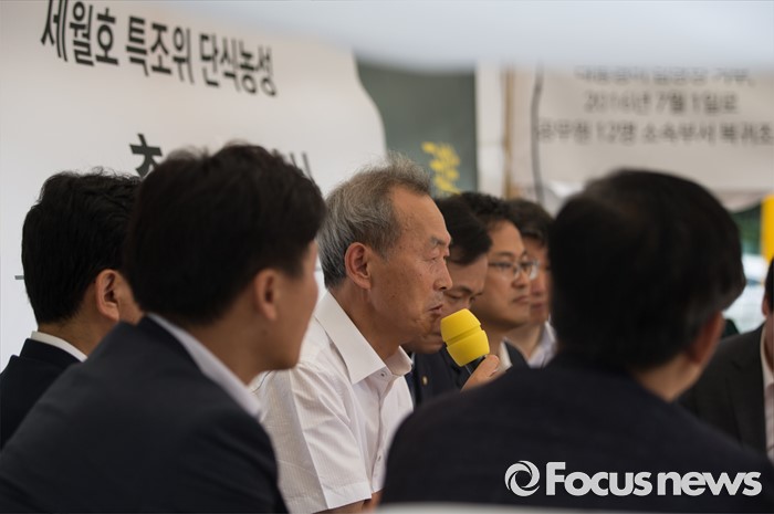 (서울=포커스뉴스) 1일 오전 서울 종로구 광화문 광장에서 단식농성중인 이석태 세월호 참사 특별조사위원장이 더불어민주당 의원들에게 특조위 입장에 대한 설명을 하고 있다.