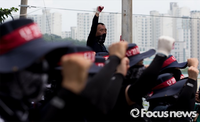 (아산=포커스뉴스) 1일 오후 충남 아산 탕정면 갑을오토텍에서 노조원들이 사측 경비 용역 진입을 반대하며 구호를 외치고 있다.
