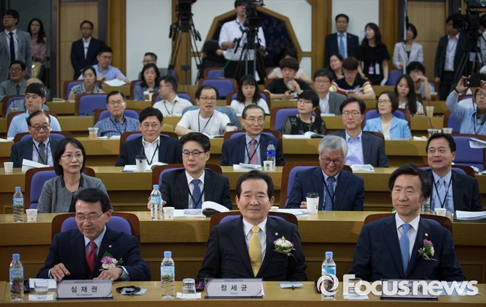(서울=포커스뉴스) 3일 오전 서울 여의도 국회 의원회관에서 열린 공공외교법 발효기념 심포지엄에 정세균(앞줄 가운데) 국회의장, 윤병세(앞줄 오른쪽) 외교부 장관, 심재권(앞줄 왼쪽) 국회 외교통일위원장 등이 참석하고 있다.