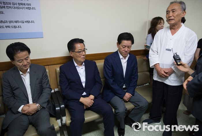 (서울=포커스뉴스) 박지원 국민의당 비상대책위원장과 의원들이 2일 종로구 서울대학교병원을 찾아 지난해 민중총궐기 당시 경찰의 물대포를 맞고 입원 중인 백남기 농민을 위로 방문한 뒤 정현찬 백남기대책위 공동대표의 설명을 듣고 있다. 왼쪽부터 정동영 의원, 박 비대위원장, 주승용 의원, 정 공동대표.