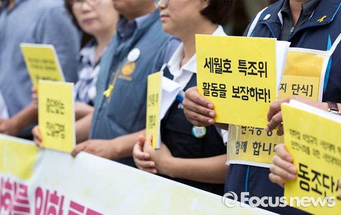 (서울=포커스뉴스) 2일 오전 서울 종로구 광화문광장에서 지하철 비정규직 사망재해 해결과 안전사회를 위한 시민대책위원회가 세월호 특조위 동조단식 돌입 기자회견을 하고 있다.