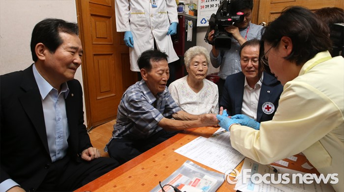 (서울=포커스뉴스) 정세균 국회의장이 2일 오전 서울 종로구 창신동에 거주하고 있는 고령 이산가족 김문각 할아버지(84세, 평안남도 양덕군 청계리) 가정을 방문해 김 할아버지의 이산가족 상봉 준비를 위한 혈액 채취 과정을 지켜보고 있다.