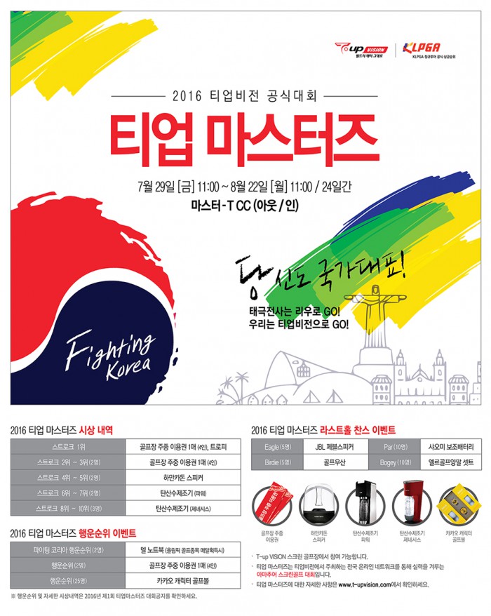 특히 이번 '티업마스터즈'는 골프가 112년만에 올림픽 정식 종목으로 채택된 것을 기념해 '2016 리우 올림픽'에 출전하는 모든 태극전사를 응원하는 마음을 담아 포스터 이미지를 제작했다.