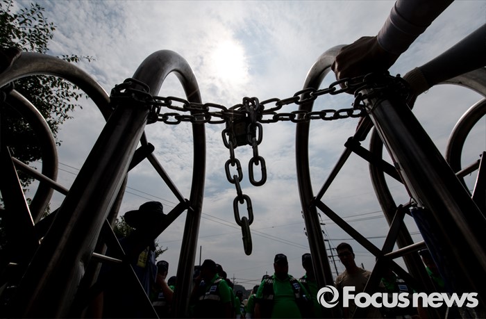 (아산=포커스뉴스) 1일 오후 충남 아산 탕정면 갑을오토텍에서 노조원들과 사측 경비 용역들이 대치하고 있다.