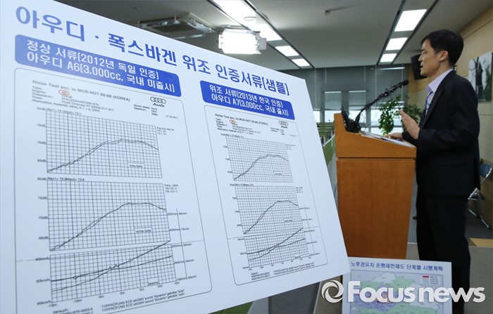 (세종=포커스뉴스) 홍동곤 환경부 교통환경과장이 2일 오전 세종시 정부세종청사 환경부 기자실에서 위조서류로 불법인증을 받은 폭스바겐 32개 차종(80개 모델)에 대해 인증취소 처분을 내렸다고 밝히고 있다.