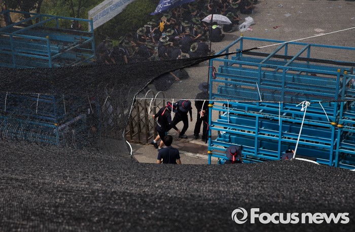 (아산=포커스뉴스) 1일 오전 충남 아산 탕정면 갑을오토텍에서 노조원들이 사측의 경비 용역 투입에 대비하고 있다.