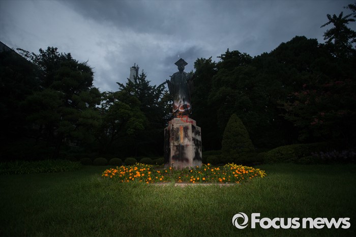 (서울=포커스뉴스) 이화여대 미래라이프 대학 설립 문제로 학교와 학생들이 갈등을 빚고 있는 2일 밤, 서울 서대문구 이화여대 본관 인근에 김활란 초대 총장의 동상이 페인트와 계란으로 얼룩져있다.