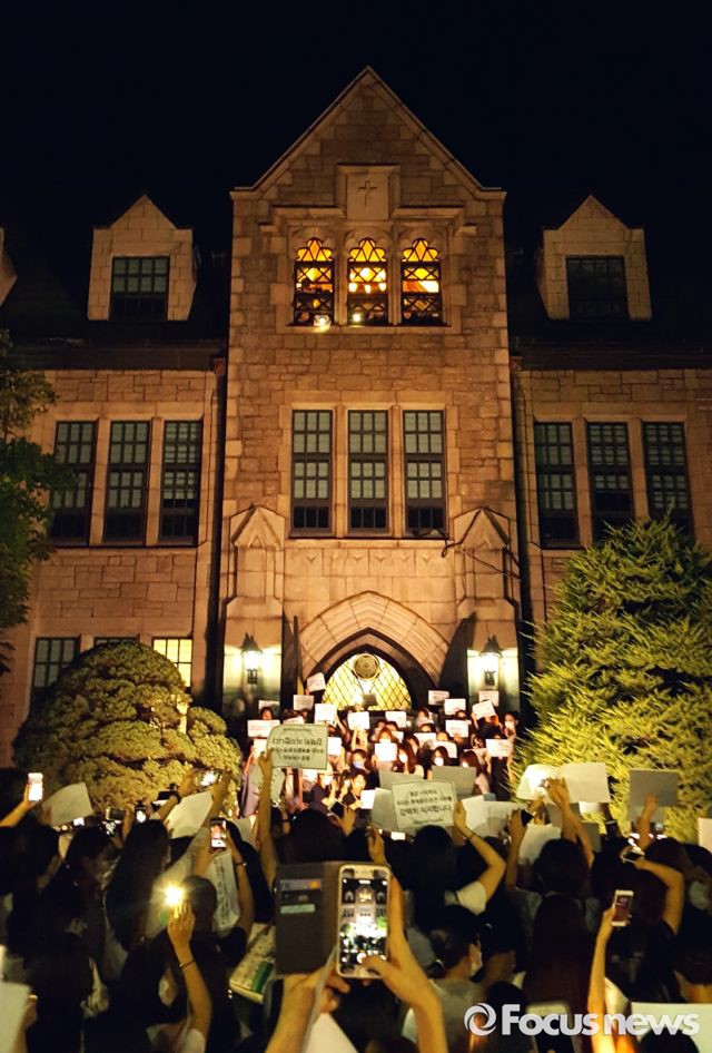 (서울=포커스뉴스) 지난 3일 오후 서울 서대문구 이화여자대학교에서 졸업생들이 최경희 총장 퇴진을 요구하며 집회를 하고 있다. <사진제공=이화여대 언론팀>