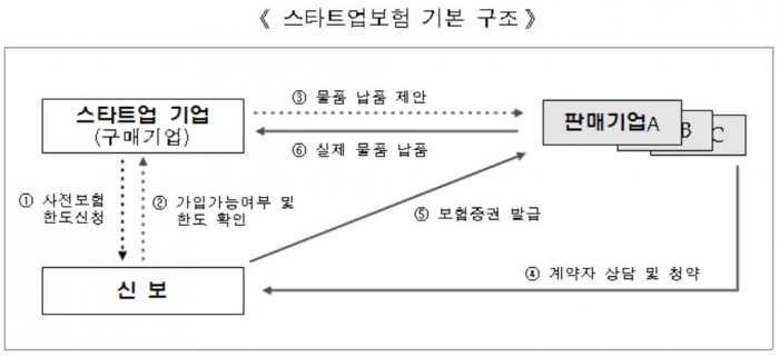 이번에 출시하는 스타트업 보험은 신용도가 낮아 외상구매가 어려운 창업 초기 기업을 지원하는 보험상품이다. 스타트업이 신용보증기금에 사전 보험 한도를 신청하면, 가능 여부를 확인받는다. 이후 보험에 가입한 스타트업은 판매자로부터 외상구매가 가능하게 된다.
