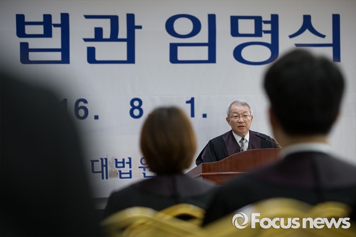 (서울=포커스뉴스) 1일 오전 서울 서초동 대법원에서 열린 신임 법관 임명식에서 양승태 대법원장이 인사말을 하고 있다.