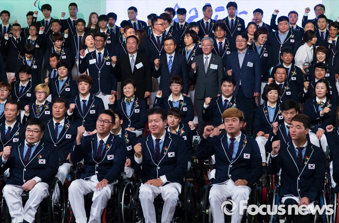(서울=포커스뉴스) 2일 오후 서울 송파구 올림픽파크텔에서 열린 2016 리우 패럴림픽 대한민국 선수단 결단식에 자리한 황교안 국무총리를 비롯한 내빈들과 출전 선수단이 파이팅을 외치며 기념촬영 하고 있다.