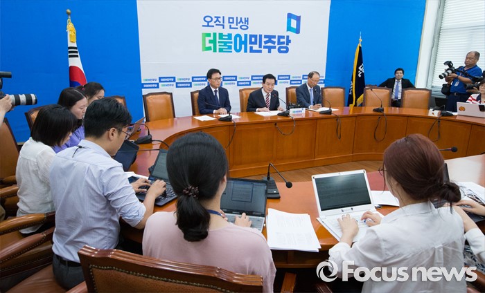 (서울=포커스뉴스) 변재일 더불어민주당 정책위의장이 2일 오전 서울 여의도 국회에서 세법개정안 관련 기자간담회를 하고 있다. 왼쪽부터 박광온 기획재정위원회 간사, 변 정책위의장, 최운열 정책위부의장.