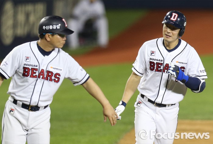 (서울=포커스뉴스) 3일 서울 잠실구장에서 열린 2016 프로야구 LG-두산 경기 6회말 두산 김재호가 좌월 솔로 홈런을 치고 3루에서 전형도 코치의 환영을 받고 있다.