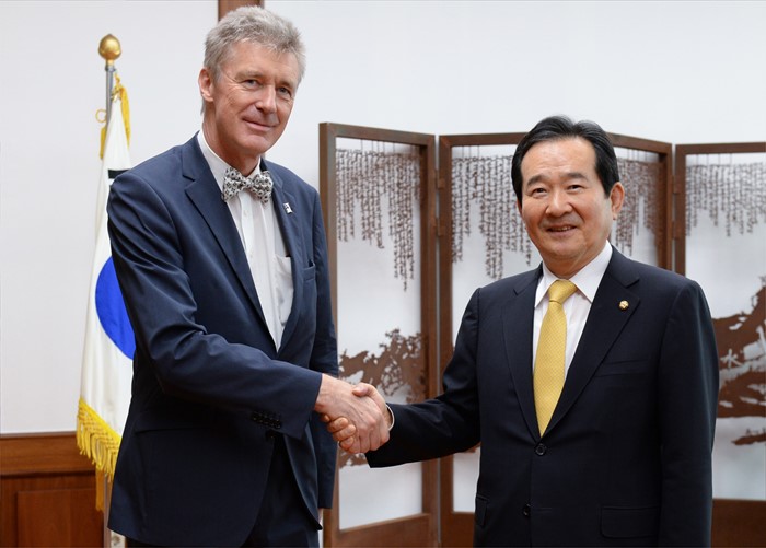 (서울=포커스뉴스) 정세균(오른쪽) 국회의장이 3일 오후 서울 여의도 국회를 방문한 게하르트 사바틸(Gerhard SABATHIL) 주한EU대사와 만나 면담에 앞서 악수하고 있다. <사진제공=국회>