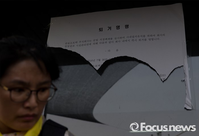 (아산=포커스뉴스) 1일 오후 충남 아산 탕정면 갑을오토텍에서 노조원들과 사측 경비 용역들이 대치하고 있다.