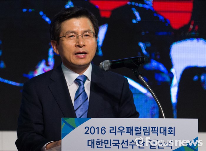 (서울=포커스뉴스) 황교안 국무총리가 2일 오후 서울 송파구 올림픽파크텔에서 열린 2016 리우 패럴림픽 대한민국 선수단 결단식에 자리해 격려사를 하고 있다.